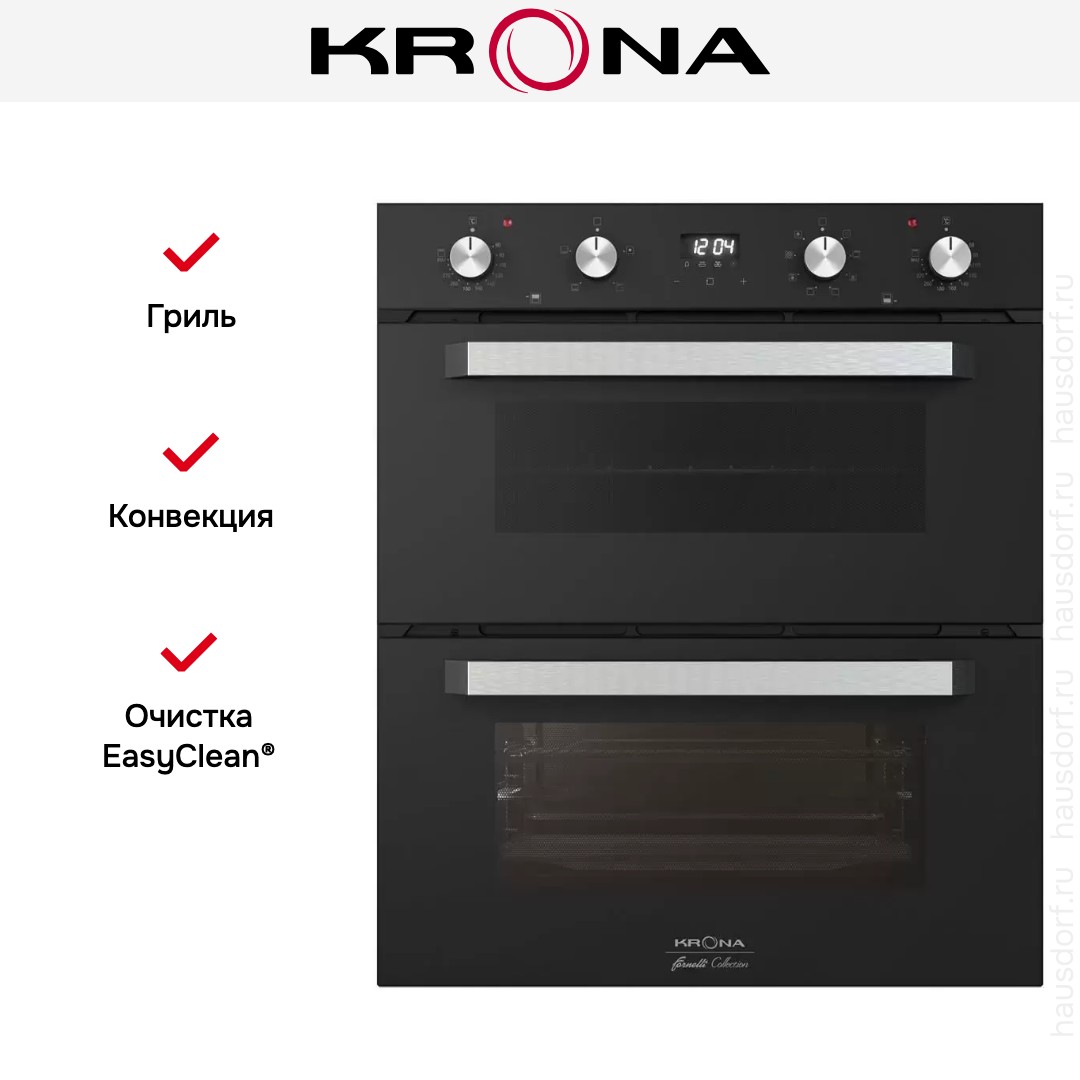 Количество режимов работы в духовом шкафу Крона: 9. В число доступных программ входят: конвекция, гриль для создания хрустящей корочки, и другие. Тип гриля в этой модели — электрический.