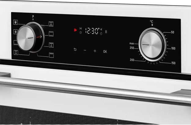 Особенности дизайна и внешней панели управления — также важный пункт при выборе духовки на кухню. В данной модели нужно обратить внимание на цвет — белый,
