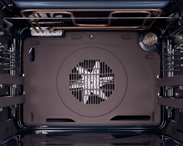 Нижний нагревательный элемент способствует быстрому повышению температуры воздуха в камере. В то же время начинает работать кольцевой нагревательный элемент на задней стенке камеры: расположенный внутри его контура вентилятор равномерно распространяет оба потока горячего воздуха по всему объему камеры. Таким образом, при размещении противня на третьем или втором уровне нижняя сторона блюда будет поджариваться за счет действия ТЭНа, а верхняя — запекаться под действием горячего воздуха, так что начинка всегда будет оставаться мягкой и сочной.