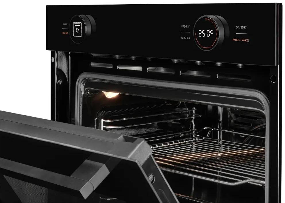 При помощи электронного программатора можно не только определить способ нагрева и температуру, но и установить таймер с автоматическим отключением, отложить запуск на любое удобное время, выбрать предустановленные программы, сохранять в памяти собственные рецепты. На дисплее появляются также сообщения об ошибках, выводятся данные о блокировке дверцы или панели управления.