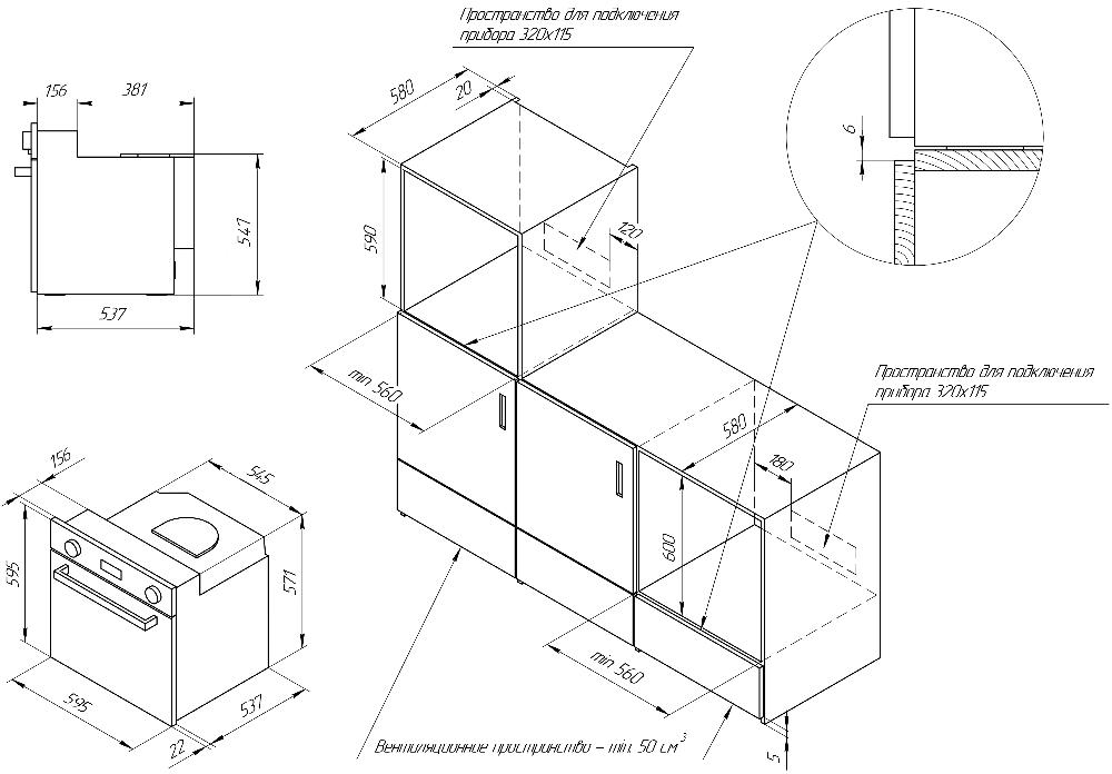 При установке требуется строго соблюдать правила техники безопасности — в частности, выдерживать размеры всех зазоров между стенками духовки и стенками мебели, необходимые для беспрепятственной циркуляции воздуха. Так, расстояние до боковых стенок мебели должно составлять не менее 0,5–1 см, а до задней стенки — не менее 4–5 см.