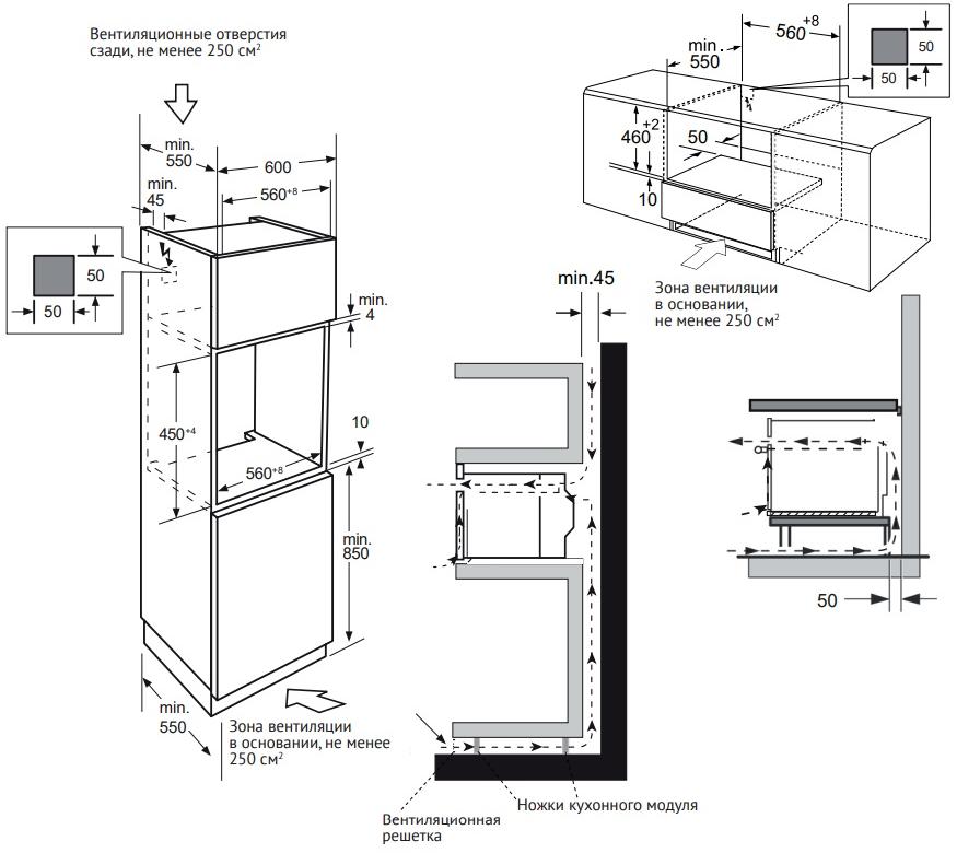 При установке требуется строго соблюдать правила техники безопасности — в частности, выдерживать размеры всех зазоров между стенками духовки и стенками мебели, необходимые для беспрепятственной циркуляции воздуха. Так, расстояние до боковых стенок мебели должно составлять не менее 0,5–1 см, а до задней стенки — не менее 4–5 см.