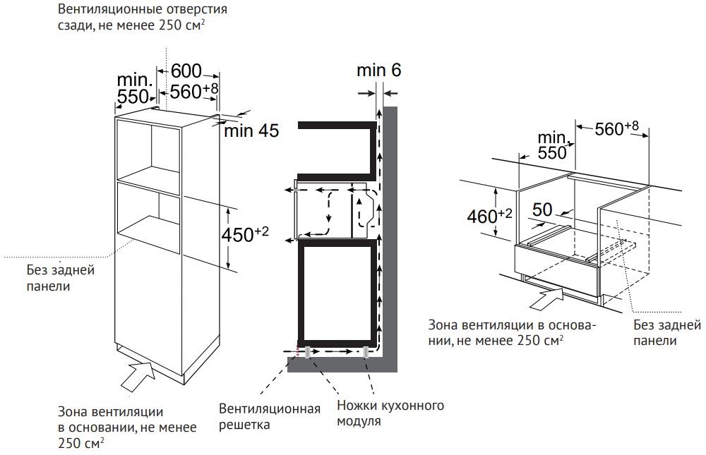 При установке требуется строго соблюдать правила техники безопасности — в частности, выдерживать размеры всех зазоров между стенками духовки и стенками мебели, необходимые для беспрепятственной циркуляции воздуха. Так, расстояние до боковых стенок мебели должно составлять не менее 0,5–1 см, а до задней стенки — не менее 4–5 см.