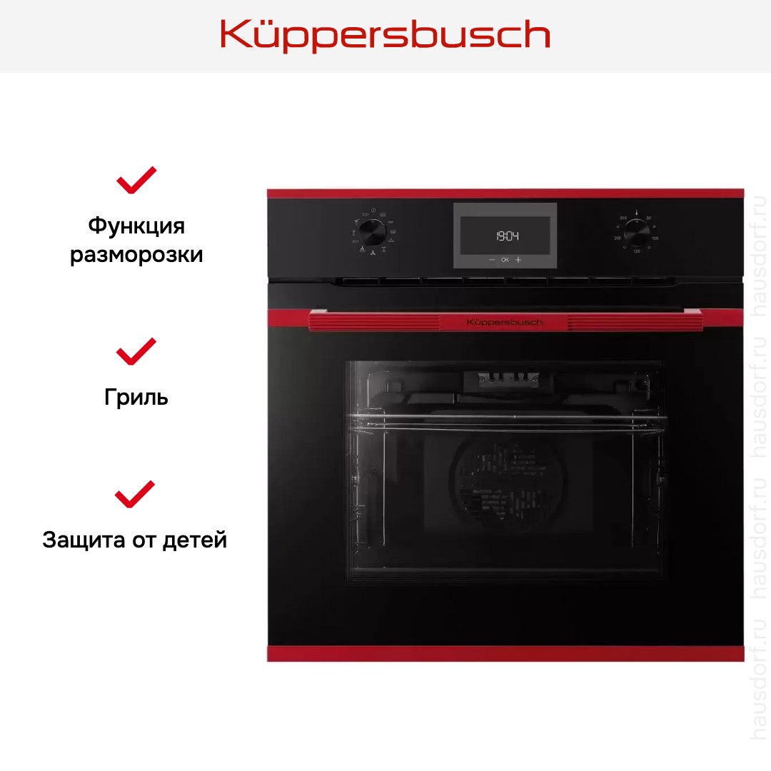Духовой шкаф Kuppersbusch B 6330.0 S8-Airfry в черном цвете дополнен красной ручкой. Контрастное сочетание будет наиболее выигрышно смотреться в современных интерьерах. Стеклянный фронт модели практичен в уходе, так как легко очищается от загрязнений, разводов, отпечатков рук. Камера объемом 70 литров удобна в эксплуатации. Пять уровней для приготовления позволяют готовить одновременно на нескольких противнях. Три стекла на двери повышают уровень безопасности, так как внешняя поверхность не перегревается, что исключает риск получения ожога при прикосновении. Духовой шкаф Купперсбуш B 6330.0 S8 оборудован большим информативным дисплеем с понятными символами.