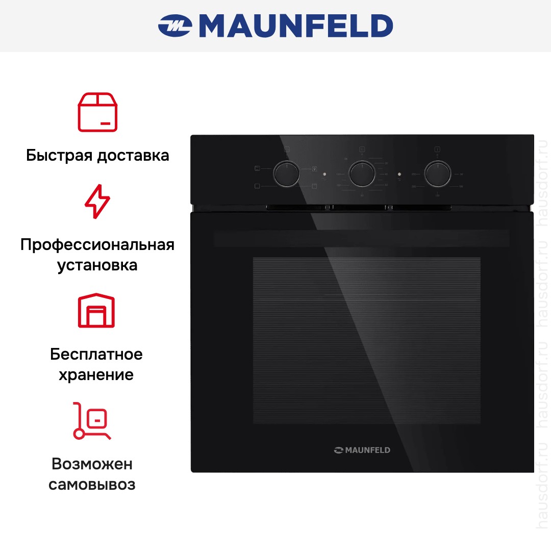 Maunfeld AEOC6040B2 — независимая электрическая духовка, оформленная в строгой чёрной гамме с простой фурнитурой того же оттенка. Передняя панель выполнена лаконично: тёмное стекло сочетается с плоской рамой, откидная дверца с тройным остеклением составляет единое целое с корпусом и выглядит безопасно, внутренняя поверхность сохраняет аккуратный вид благодаря эмали лёгкой очистки.