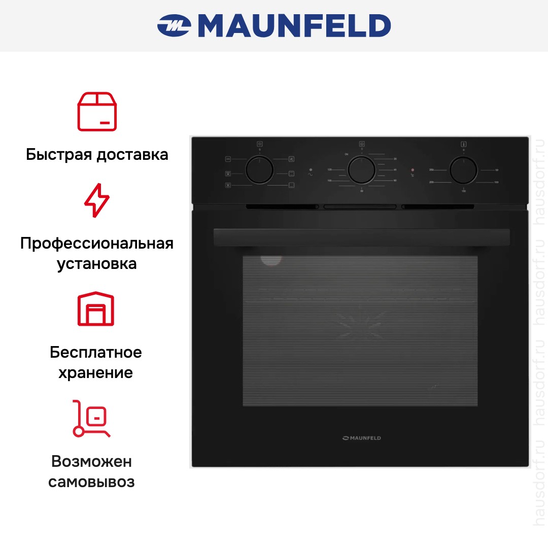 Maunfeld AEOF6060B2 — встраиваемая электрическая печь с набором всех необходимых функций, созданная для тех, кто ценит в технике практичность и не желает переплачивать. Лицевая часть выполнена в глубоком черном цвете с матовой фурнитурой того же оттенка, что создает ощущение основательности и безопасности. Откидывающаяся дверца с двумя слоями стекла гарантирует удобный доступ к внутренней части и отличный обзор.
