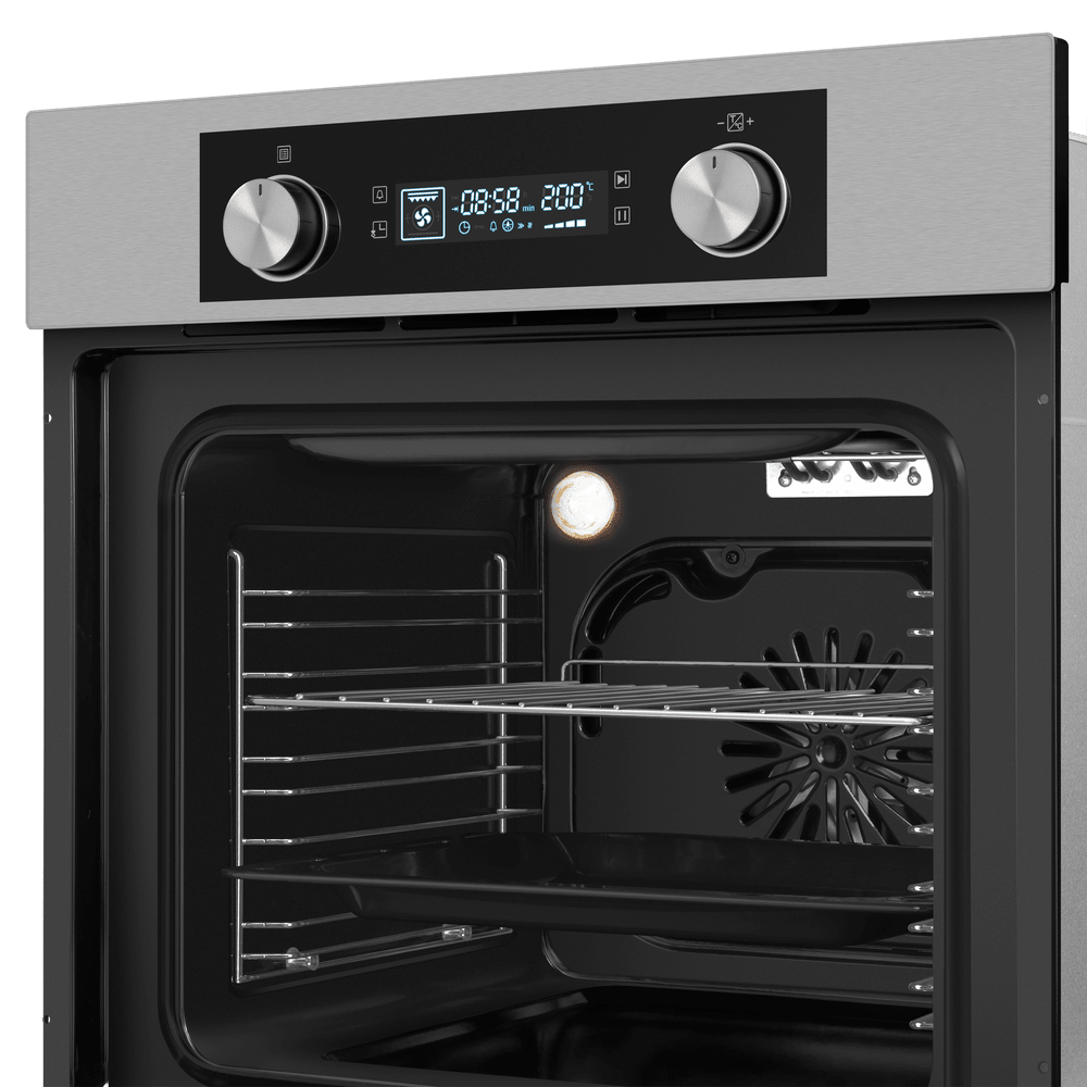 Особенности дизайна и внешней панели управления — также важный пункт при выборе духовки на кухню. В данной модели нужно обратить внимание на цвет — нержавеющая сталь,