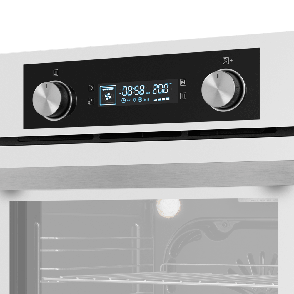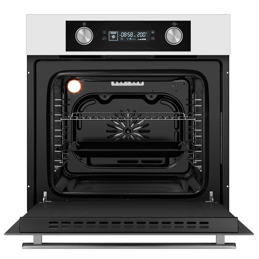 Особенности дизайна и внешней панели управления — также важный пункт при выборе духовки на кухню. В данной модели нужно обратить внимание на цвет — белый,