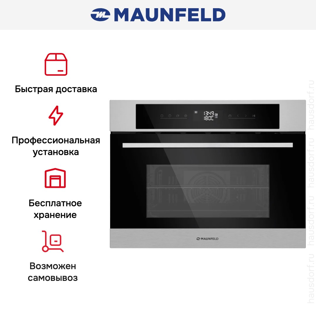 MAUNFELD AMCO458S — компактная независимая электрическая духовка с фасадом из нержавеющей стали. Удобная ручка-рейлинг также выполнена из стали, сенсорные кнопки и встроенный дисплей читаются ясно, а откидная дверца с тремя стеклами темного оттенка создаёт впечатление продуманной сборки и надёжной теплоизоляции.
