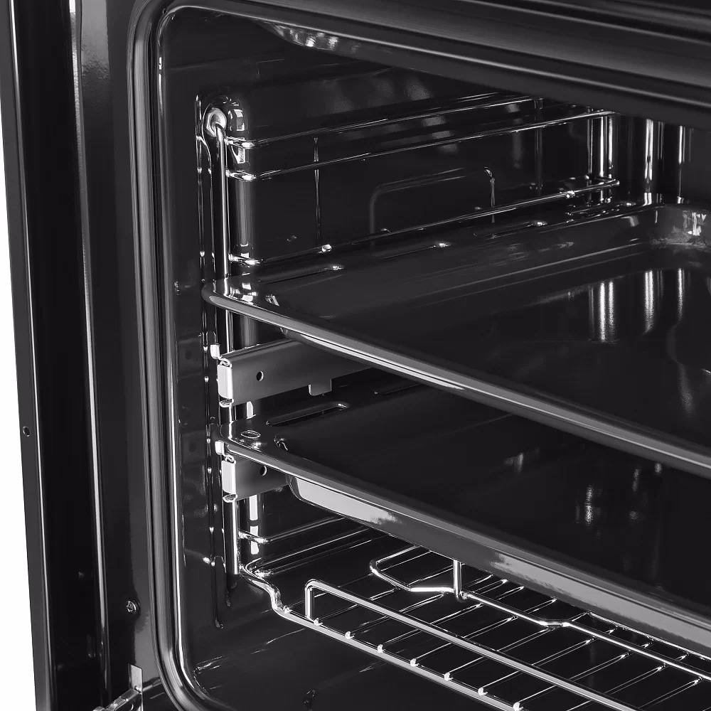 Духовой шкаф с электронным программатором и удобным сенсорным управлением, дисплеем с индикацией холодного белого цвета. Камера покрыта изнутри черной эмалью легкой очистки, поэтому удалить кусочки пищи, капли жира, влагу получится максимально быстро. Среди 11 режимов есть конвекция, гриль, верхний и нижний нагрев, а также комбинирование этих функций. Дополнительный режим «нижний нагрев + конвекция» подойдет для выпекания пирогов, а «двусторонний нагрев +конвекция» значительно сократит время приготовления за счет равномерного распределения горячего воздуха.