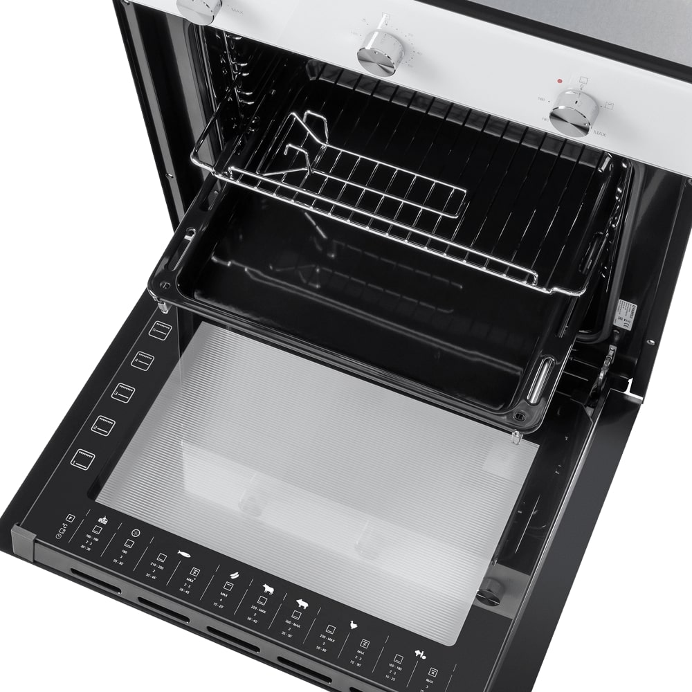 Особенности дизайна и внешней панели управления — также важный пункт при выборе духовки на кухню. В данной модели нужно обратить внимание на цвет — белый, охлаждение двери, чтобы поверхность и мебель вокруг не нагревались. Механическая панель управления позволяет быстро разобраться в настройке программ и не требует чрезмерных усилий.