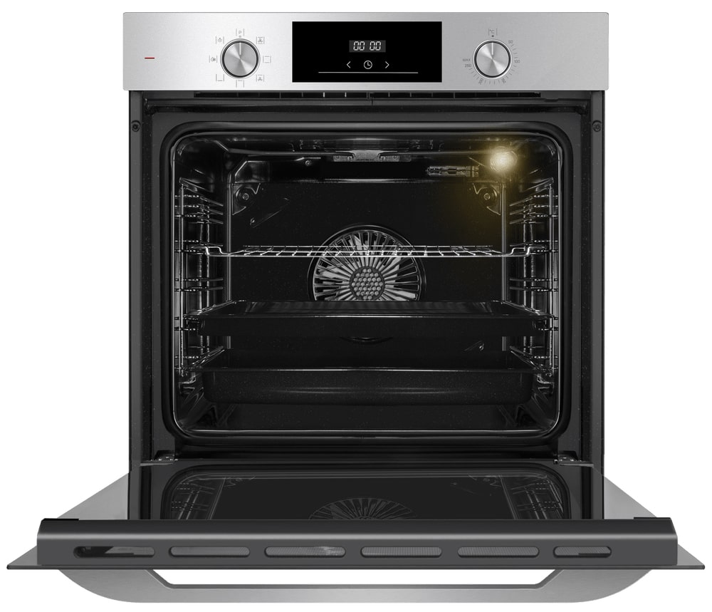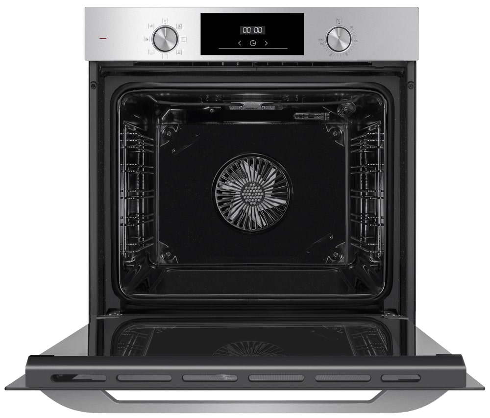 Особенности дизайна и внешней панели управления — также важный пункт при выборе духовки на кухню. В данной модели нужно обратить внимание на цвет — нержавеющая сталь,
