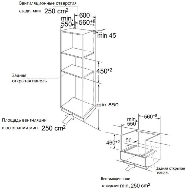 При установке требуется строго соблюдать правила техники безопасности — в частности, выдерживать размеры всех зазоров между стенками духовки и стенками мебели, необходимые для беспрепятственной циркуляции воздуха. Так, расстояние до боковых стенок мебели должно составлять не менее 0,5–1 см, а до задней стенки — не менее 4–5 см.