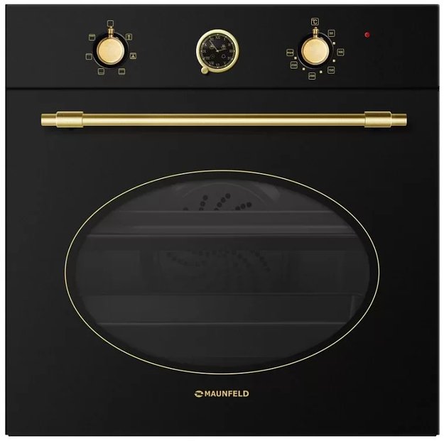 Maunfeld MEOFG.676RBG.TR — электрический духовой шкаф с грилем и конвекцией. Модель оборудована съемной дверцей с черным стеклянным фронтом и дополнена золотистой фурнитурой в рустикальном стиле. Для контроля времени приготовления предусмотрен механический таймер. Духовка издаст звуковой сигнал по истечении установленного времени. Внутреннее освещение и смотровое окно обеспечивают хороший обзор содержимого, что позволяет контролировать процесс приготовления без открытия дверцы и, как следствие, потере тепла. Модель укомплектована двумя противнями и решеткой. Среди преимуществ: съемная дверца, механический таймер, подсветка.
