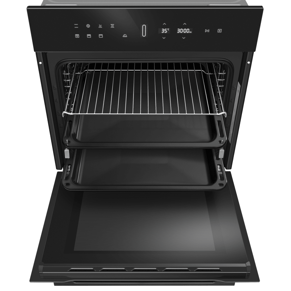 Особенности дизайна и внешней панели управления — также важный пункт при выборе духовки на кухню. В данной модели нужно обратить внимание на цвет — черный, охлаждение двери, чтобы поверхность и мебель вокруг не нагревались.