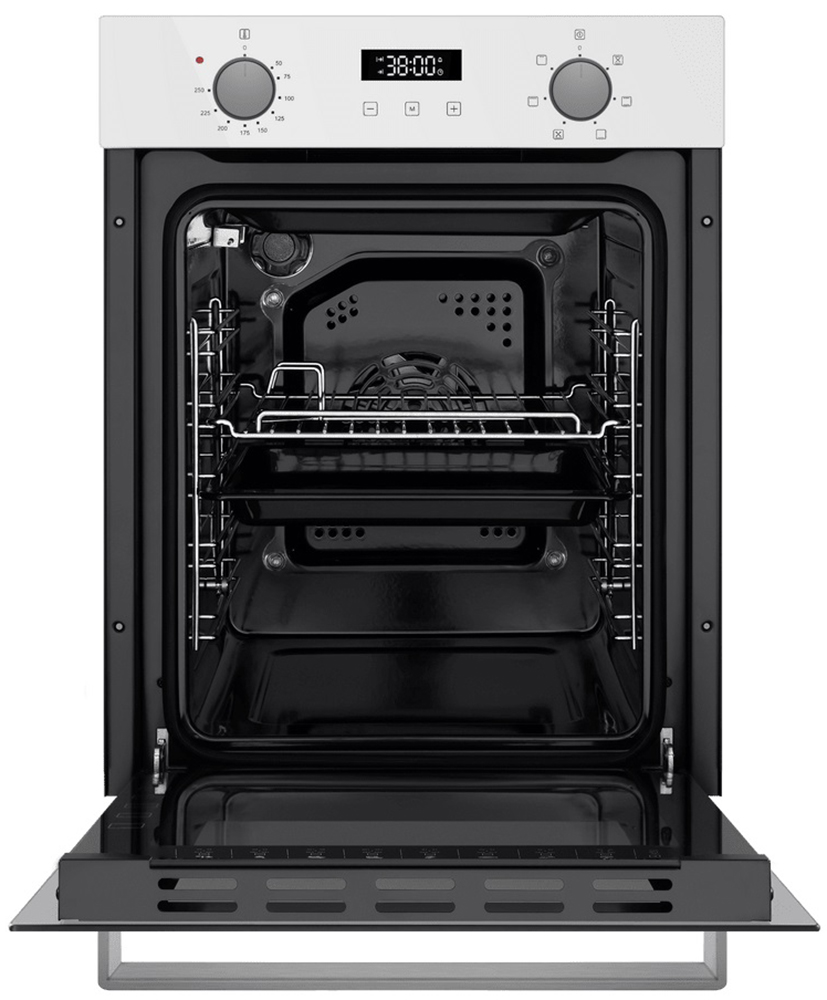 Особенности дизайна и внешней панели управления — также важный пункт при выборе духовки на кухню. В данной модели нужно обратить внимание на цвет — белый, охлаждение двери, чтобы поверхность и мебель вокруг не нагревались.