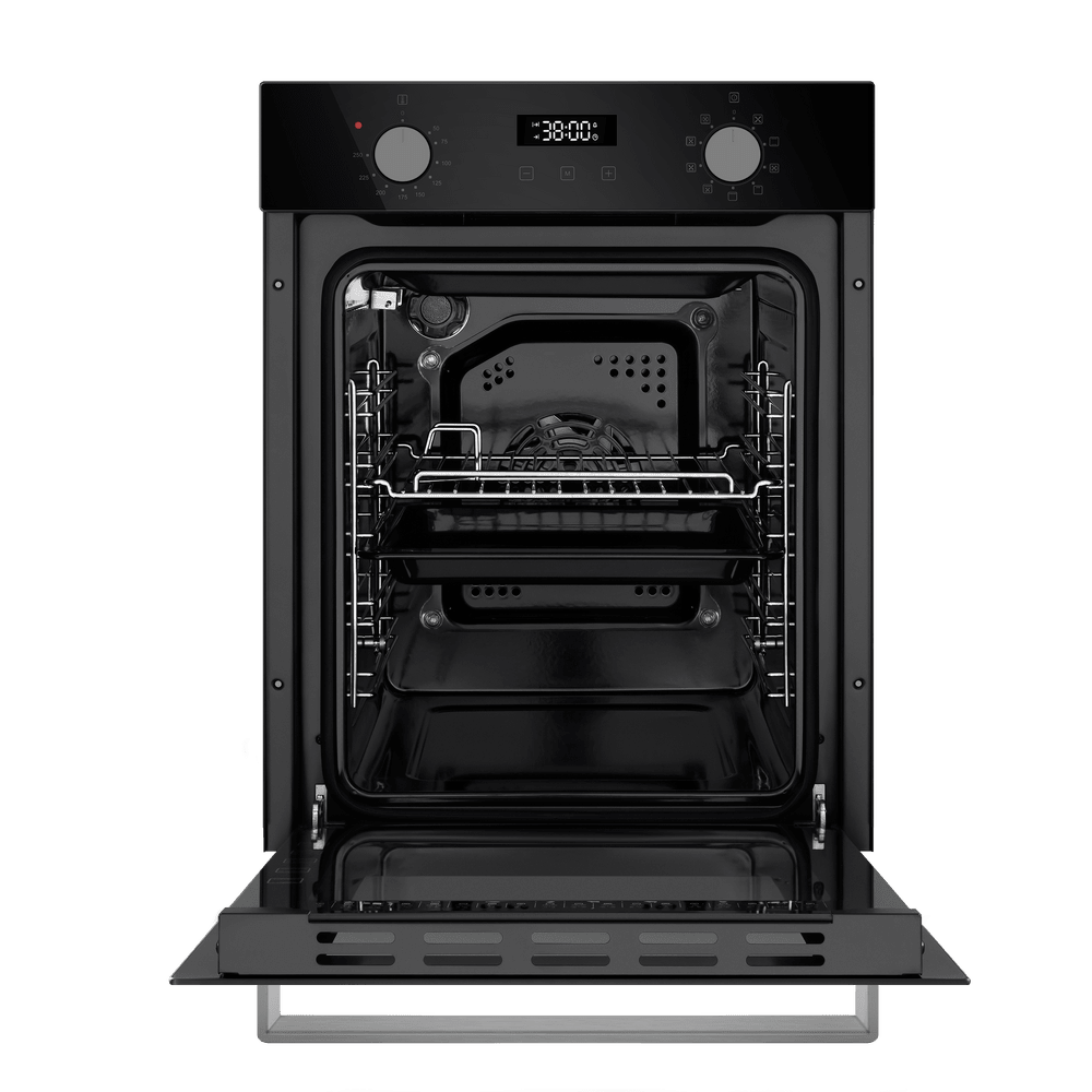 Как известно, стандартная ширина кухонной тумбы составляет около 60 см — поэтому за стандартную ширину встраиваемого духового шкафа принимают 59,5 см. Такие духовки имеют по 3–4 уровня приготовления, в них можно приготовить достаточно объемные блюда. Минимальное значение ширины духовки также соотносится с размерами тумбы для встраивания — оно составляет 44–45 см. Это хороший выбор для небольшой кухни, однако узкие духовые шкафы имеют свои недостатки — в частности, в них невозможно приготовить большой пирог или торт, запечь целый окорок, индейку или большую рыбу.