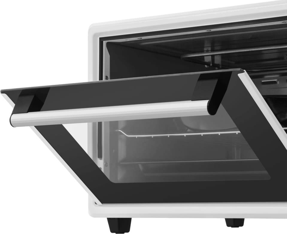 Навесной способ открытия преобладает у настольных моделей: петли в этом случае располагаются слева или справа, а дверца открывается за ручку, расположенную с другой стороны, — так же, как у микроволновки или холодильника. Оригинальна и безопасна выдвижная дверца у электрических духовок — к ней с внутренней стороны прикрепляются все комплектующие, включая противни и направляющие. При выдвижении все они также извлекаются наружу, понижая тем самым риск ожога. Недостаток этого способа — постоянное изменение температуры при каждом открытии дверцы.