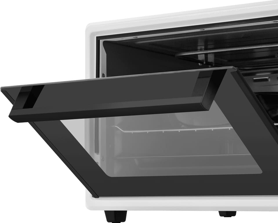 Особенности дизайна и внешней панели управления — также важный пункт при выборе духовки на кухню. В данной модели нужно обратить внимание на цвет — белый, Механическая панель управления позволяет быстро разобраться в настройке программ и не требует чрезмерных усилий.