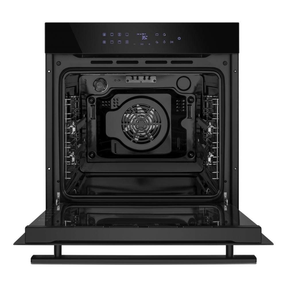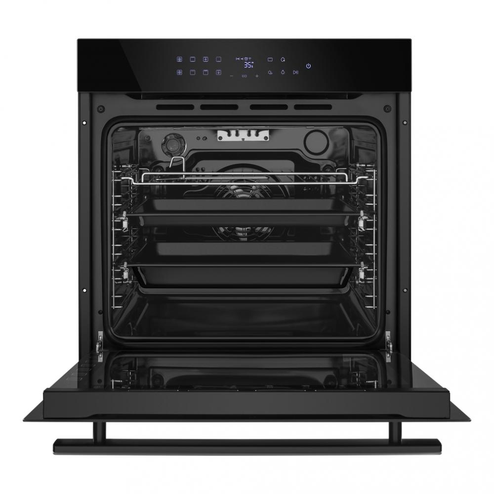 Духовку Маунфилд EOEH-7611-SCB отличает прежде всего камера очень большого объема — 76 литров. Противни в ней могут размещаться на 6 уровнях. Фронтальная часть изделия выглядит элегантно и современно: тонированное стекло черного цвета в сочетании с черной же фурнитурой подойдет для любой кухни. Откидная дверца снабжена доводчиком для мягкого и плавного закрытия. Ручка ее также отделана стеклом, а корпус прибора изготовлен из металла.