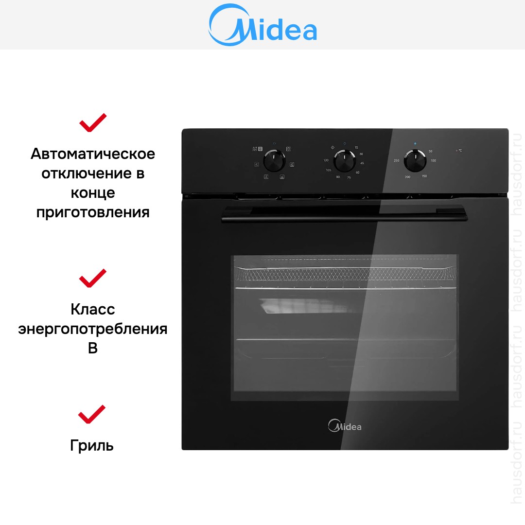 Количество режимов работы в духовом шкафу Мидеа: 7. В число доступных программ входят: гриль для создания хрустящей корочки, и другие. Помимо основных программ воспользуйтесь специальными возможностями этого прибора: вентилятором, совмещенным с нижним нагревом; и другими. Тип гриля в этой модели — электрический.