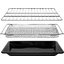 В стандартную комплектацию любого духового шкафа входят один или два противня — эмалированных или с антипригарным покрытием — и решетка. Единственный противень, как правило, имеет низкие бортики и предназначается для приготовления выпечки. Если духовка комплектуется двумя противнями, то второй отличается более высокими бортиками — его можно использовать для запекания мяса, птицы, овощных блюд. На решетке в духовке, не оснащенной грилем, обычно устанавливаются формы для запекания — стальные, керамические или стеклянные. В духовках премиум-класса количество противней может быть увеличено: к стандартному комплекту добавляются противни с перфорацией для мяса, специальные поддоны для сбора выделившегося сока.