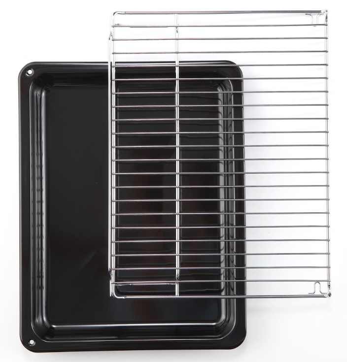 В стандартную комплектацию любого духового шкафа входят один или два противня — эмалированных или с антипригарным покрытием — и решетка. Единственный противень, как правило, имеет низкие бортики и предназначается для приготовления выпечки. Если духовка комплектуется двумя противнями, то второй отличается более высокими бортиками — его можно использовать для запекания мяса, птицы, овощных блюд. На решетке в духовке, не оснащенной грилем, обычно устанавливаются формы для запекания — стальные, керамические или стеклянные. В духовках премиум-класса количество противней может быть увеличено: к стандартному комплекту добавляются противни с перфорацией для мяса, специальные поддоны для сбора выделившегося сока.
