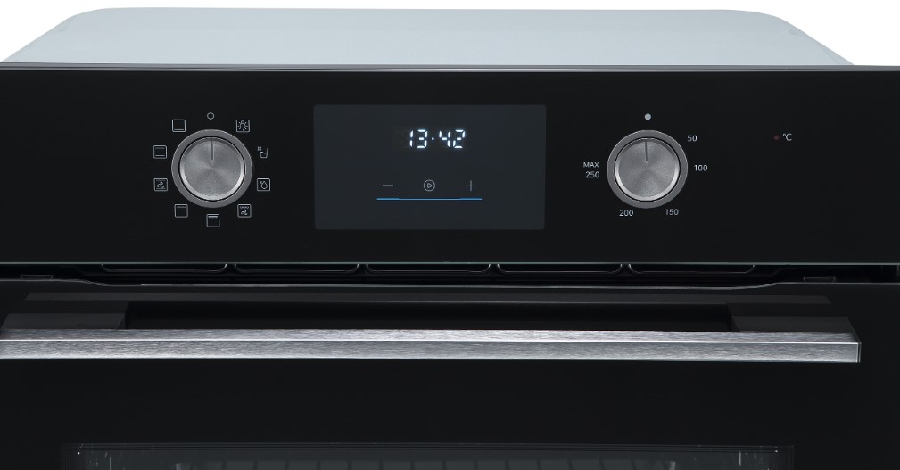 Особенности дизайна и внешней панели управления — также важный пункт при выборе духовки на кухню. В данной модели нужно обратить внимание на цвет — черный,