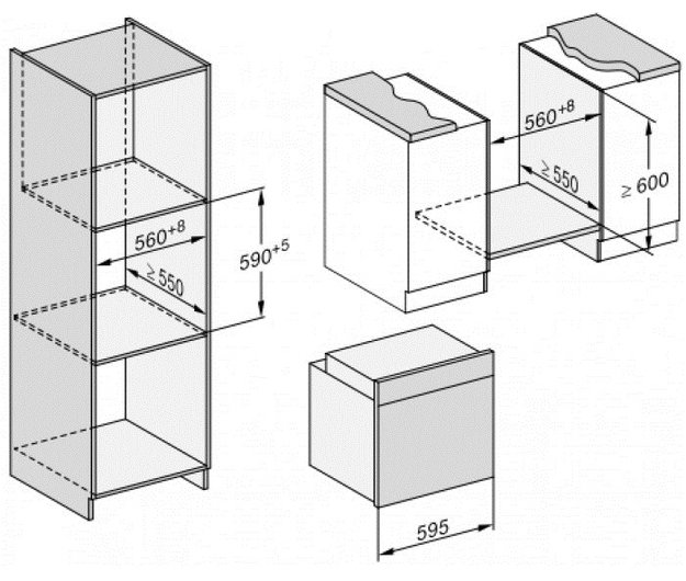 Размеры ниши для встраивания духового шкафа определяются, исходя из габаритов самого устройства. Стандартные модели обычно без труда устанавливаются в нишу шириной около 560 мм, высотой около 595 мм и глубиной примерно 550 мм. Следует помнить, что фасад устройства должен иметь большие размеры, чем величина ниши.