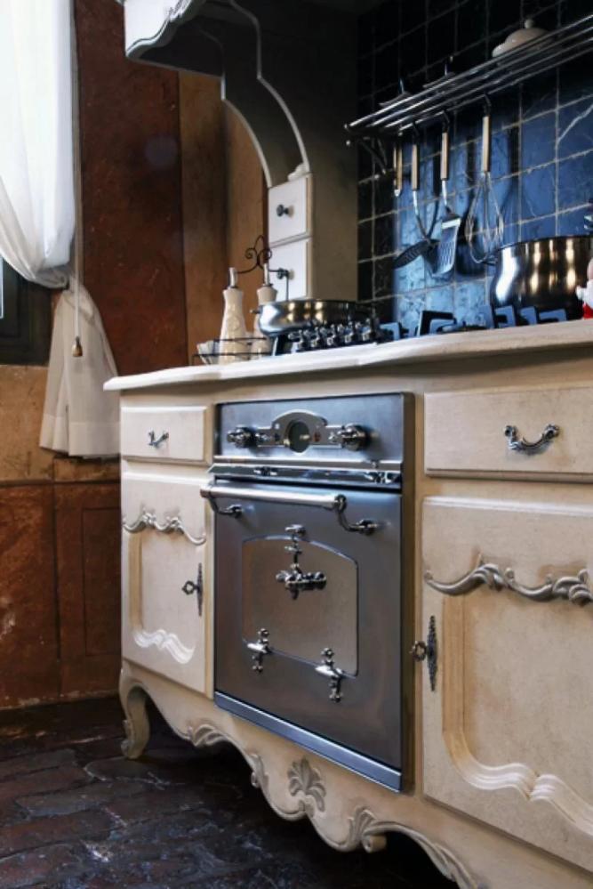 Оригинально и эффектно выглядит фурнитура цвета черненого серебра, которое также называется состаренным. Но особенно привлекательно и стильно смотрится фурнитура духовок в стиле кантри, ампир или классическом: она включает переключатели, декоративные элементы и ручки-рейлинги из латуни, бронзы и различных сплавов золотистого или медного оттенка.