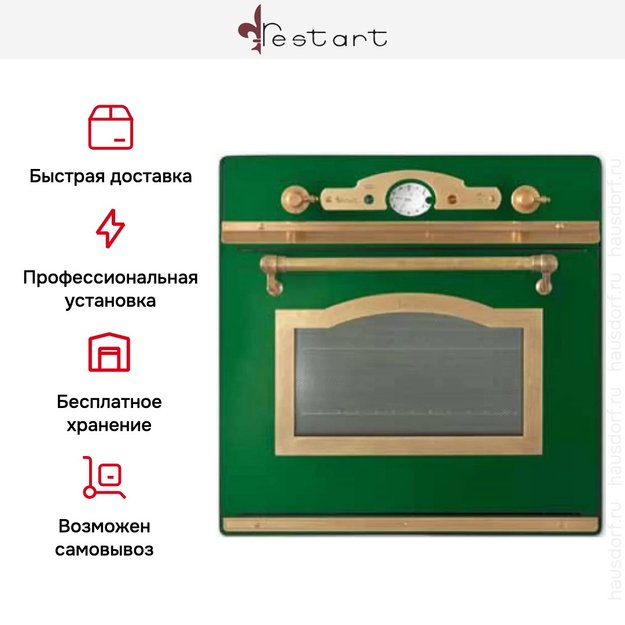 Цветные фасады духовок можно найти у таких производителей, как итальянские Smeg, ILVE, Restart, Bertazzoni, немецкие Kuppersberg и Kaiser. Эти фирмы предлагают духовки с фасадами красного, зеленого, синего, коричневого цветов с богатой и оригинальной фурнитурой, а также интересные варианты в цвете меди и платины.
