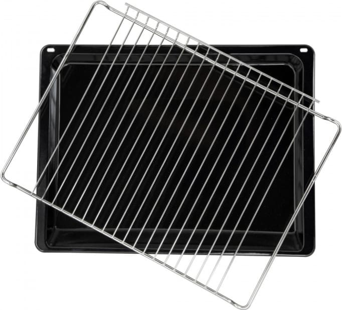 В стандартную комплектацию любого духового шкафа входят один или два противня — эмалированных или с антипригарным покрытием — и решетка. Единственный противень, как правило, имеет низкие бортики и предназначается для приготовления выпечки. Если духовка комплектуется двумя противнями, то второй отличается более высокими бортиками — его можно использовать для запекания мяса, птицы, овощных блюд. На решетке в духовке, не оснащенной грилем, обычно устанавливаются формы для запекания — стальные, керамические или стеклянные. В духовках премиум-класса количество противней может быть увеличено: к стандартному комплекту добавляются противни с перфорацией для мяса, специальные поддоны для сбора выделившегося сока.