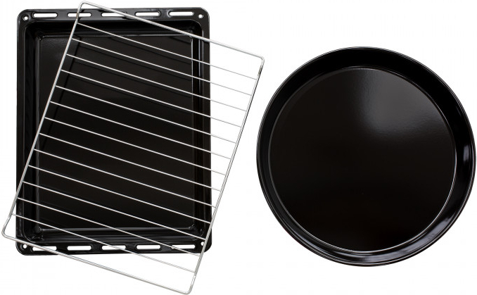 В стандартную комплектацию любого духового шкафа входят один или два противня — эмалированных или с антипригарным покрытием — и решетка. Единственный противень, как правило, имеет низкие бортики и предназначается для приготовления выпечки. Если духовка комплектуется двумя противнями, то второй отличается более высокими бортиками — его можно использовать для запекания мяса, птицы, овощных блюд. На решетке в духовке, не оснащенной грилем, обычно устанавливаются формы для запекания — стальные, керамические или стеклянные. В духовках премиум-класса количество противней может быть увеличено: к стандартному комплекту добавляются противни с перфорацией для мяса, специальные поддоны для сбора выделившегося сока.