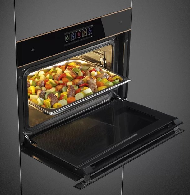 Сочетание горячего воздуха, который образуется в результате работы верхнего и нижнего нагрева и вентилятора, и режим пара, который подается в камеру при помощи специального парогенератора, позволяют готовить практически любые блюда. Горячий воздух при температуре от 140 до 250 градусов способствует получению поджаристой хрустящей корочки, а пар придает особую мягкость начинке блюда, сохраняя при этом все витамины и питательные вещества.