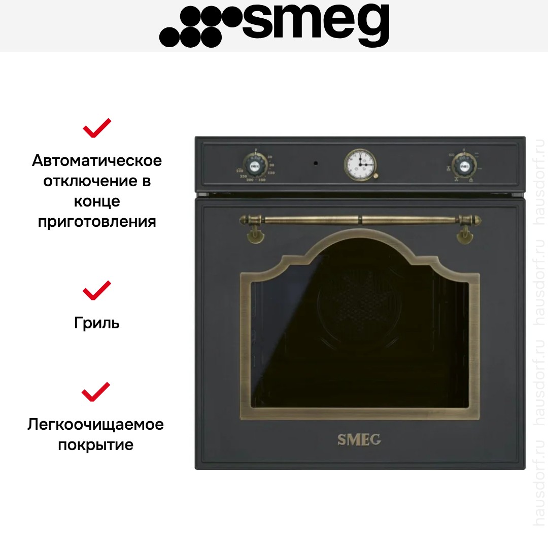 Количество режимов работы в духовом шкафу Смег: 6. В число доступных программ входят: классический нагрев, конвекция, гриль для создания хрустящей корочки, и другие.