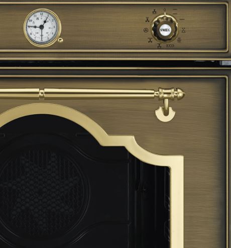 Духовой шкаф Smeg SF750OT — оригинальная модель из коллекции Cortina. Фасад изготовлен из полированной латуни с фурнитурой в тон, на панели управления размещены поворотные переключатели в стиле ретро и аналоговые часы с функцией таймера. При помощи регуляторов можно выставлять температуру в диапазоне от 50 до 250 градусов. Электронный контроллер следит за поддержанием температуры с высокой точностью. Таймер со звуковым сигналом позволяет задать продолжительность приготовления с последующим автоматическим отключением нагрева. Модель объемом 72 литра с пятью уровнями приготовления оснащена 11 режимами работы. Нагрев производится за счет верхнего, нижнего и кольцевого нагревательного элемента, большого и малого гриля, конвекции, пара, а также их комбинаций. Специальные возможности включают турборежим с использованием нагревательных элементов и вентилятора для готовки на нескольких уровнях. Функция экономичного потребления электроэнергии ECO задействует верхний, нижний нагрев и конвекцию. В целях безопасности нагрев прекращается, если дверца духовки открыта. Тангенциальная система охлаждения поддерживает низкую температуру корпуса.