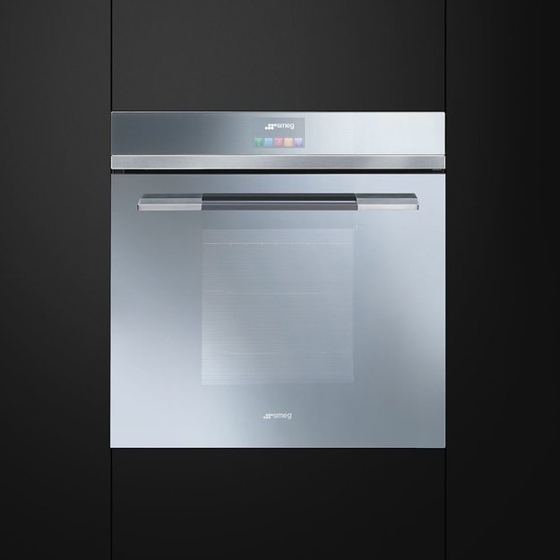 Духовой шкаф серии Linea от Smeg с цветным сенсорным дисплеем. Фронт выполнен из серебристого стекла Stopsol, четыре стекла дверцы и тангенциальная система охлаждения обеспечивают безопасную работу с прибором. Функция пиролитической очистки превращает загрязнения в пепел, который легко удалить с помощью салфетки.