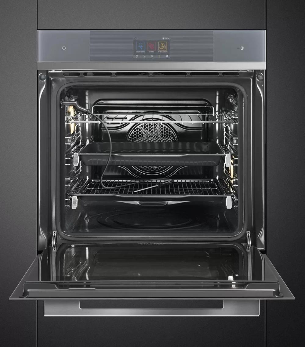 Smeg SFP6104WTPS — многофункциональный духовой шкаф объемом 70 л. Готовка может осуществляться сразу на 5 уровнях. Имеет 10 режимов приготовления, в том числе и ECO-функцию с пониженным потреблением электроэнергии. Другие полезные опции: размораживание, разогрев, поднятие теста, шаббат. Все это возможно благодаря электронному контролю температуры и постоянному ее поддержанию.