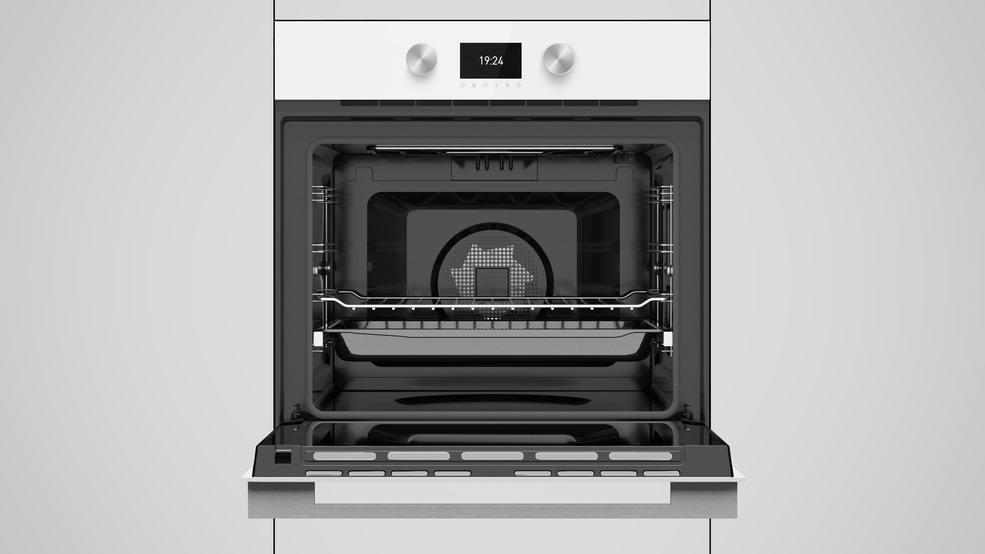 Особенности дизайна и внешней панели управления — также важный пункт при выборе духовки на кухню. В данной модели нужно обратить внимание на цвет — белое стекло,