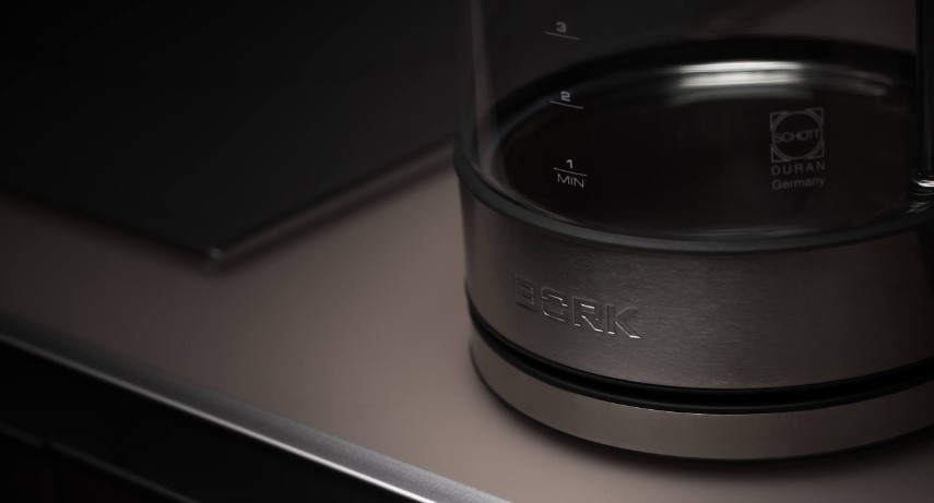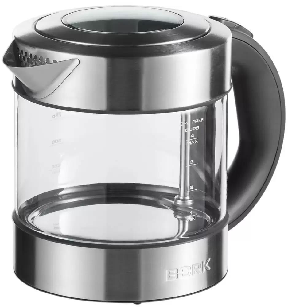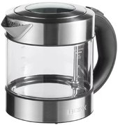 Объем колбы 1 литр, высота модели 19 см и вес всего 1,2 кг позволяют использовать этот чайник на даче или в офисе, а также брать с собой в поездки. Чайник, изготовленный из прочной нержавеющей стали и высококачественного боросиликатного стекла Schott DURAN без вредных примесей, очень удобен и прост в очистке. Это стекло отличается повышенной термической устойчивостью и увеличенной стойкостью к химическим и механическим повреждениям. На стекло нанесены удобные отметки, которые показывают не только уровень жидкости, но и время до закипания и количество чашек чая. Закрытый нагревательный элемент уменьшает образование накипи, а для полного ее устранения служит съемный фильтр из нержавеющей стали. Кипячение воды займет считанные минуты: мощность модели очень велика и достигает 2400 Вт. Специальная кнопка на эргономичной нескользящей ручке предназначена для плавного открытия крышки, исключающего разбрызгивание и защищающего владельца от пара. Здесь же располагается и кнопка включения.