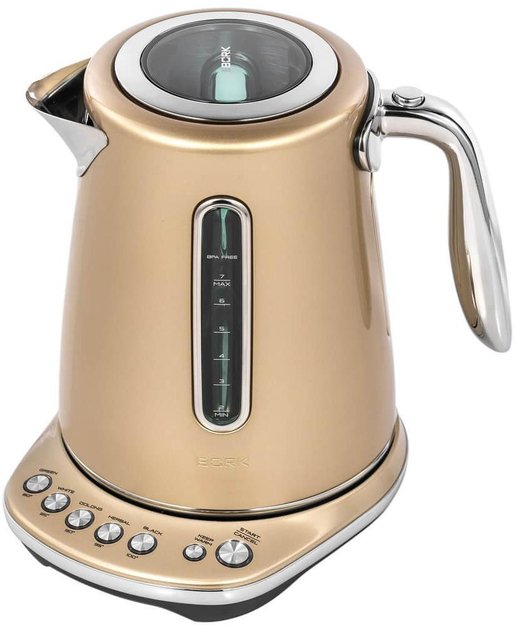 Чайник Bork выполнен из прочной нержавеющей стали, необычный оттенок шампань освежает интерьер. На поворотной базе расположены кнопки управления — своя под каждый температурный режим. Помимо температурных подсказок они снабжены пояснениями, какой режим для заваривания какого сорта чая подходит. Функция поддержания тепла позволяет сохранить необходимый нагрев до 20 минут после выключения.