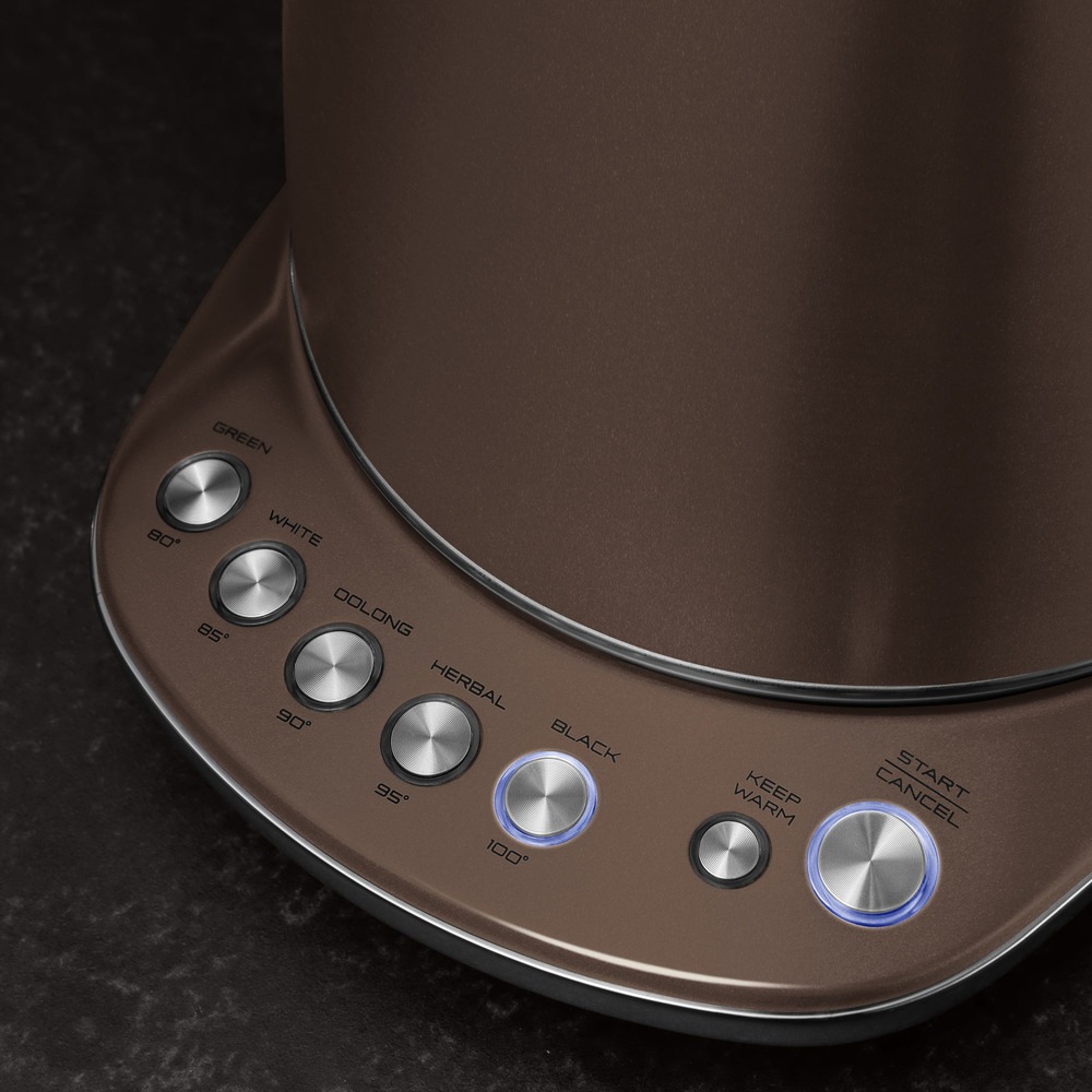 Чайник Bork выполнен из прочной нержавеющей стали, необычный оттенок грейдж освежает интерьер. На поворотной базе расположены кнопки управления — своя под каждый температурный режим. Помимо температурных подсказок они снабжены пояснениями, какой режим для заваривания какого сорта чая подходит. Функция поддержания тепла позволяет сохранить необходимый нагрев до 20 минут после выключения.