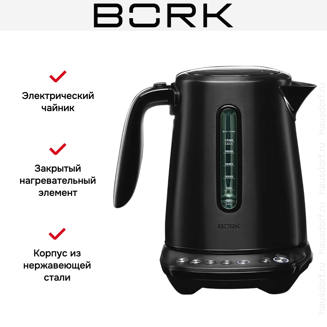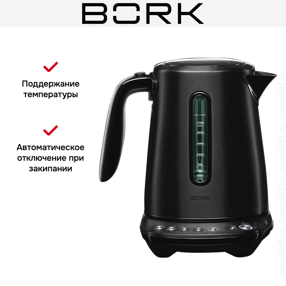 Функция поддержания заданной температуры Keep Warm для электрических чайников Bork позволяет сохранять температуру воды с точностью до градуса в течение 60 минут. Это поможет использовать приготовленный напиток длительное время без повторного кипячения в оптимальном диапазоне для заваривания чая.