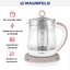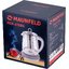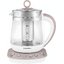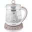 Мощность 2200 Вт гарантирует быстрое нагревание воды даже при полном объеме, а закрытый нагревательный элемент надежно защищен от накипи. Скрытая спираль легче очищается, поскольку на ней не скапливаются крупные отложения, а поверхность колбы проще протереть. Управление электронное, с кнопочными переключателями на подставке, что делает эксплуатацию интуитивной и удобной. Кнопка включения расположена на подставке, а база с поворотом на 360° позволяет подставлять чайник с любой стороны.
