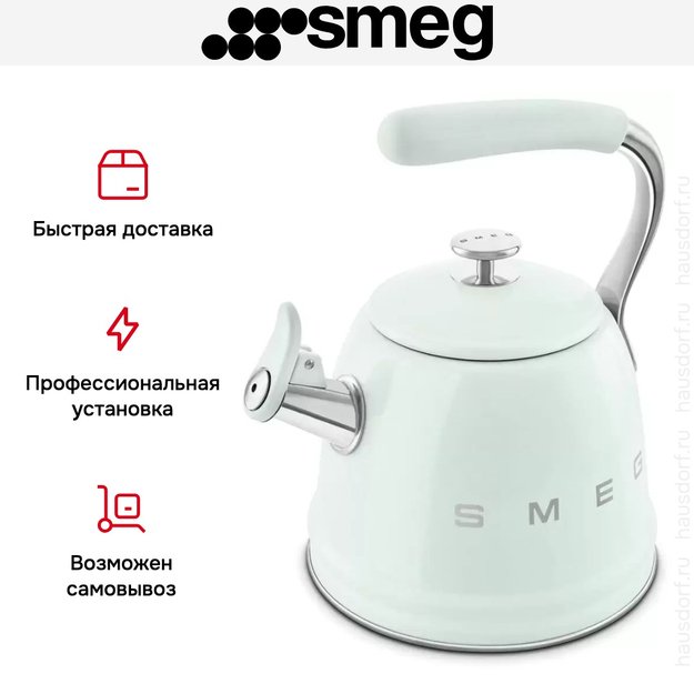 Чайник SMEG CKLW2001PG выполнен в пастельно-зеленом цвете, который придаст интерьеру свежести и уюта. Материал корпуса — нержавеющая сталь, что гарантирует долговечность и прочность изделия.