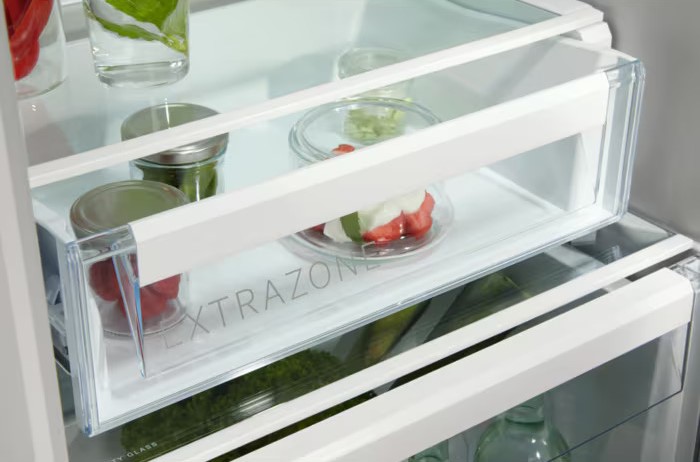 Вместительные контейнеры позволяют хранить достаточное количество овощей и фруктов. Для более длительного хранения и поддержания свежести овощей и фруктов разработаны специальные системы хранения. Среди них, например, зона свежести с увеличенной влажностью до 85% и температурой около 0 градусов. Это герметично закрывающийся ящик, часто на выдвижных роликах или направляющих, в котором имеется специальное задвижка, позволяющая регулировать влажность. Как известно, при более высокой влажности продукты с большим содержанием воды дольше остаются свежими.
