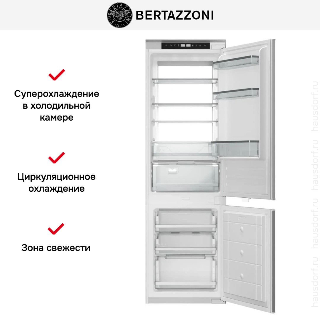 Встраиваемый холодильник Bertazzoni REF603BBNPTC — воплощение итальянского мастерства, сочетающее компактность, функциональность и безупречную интеграцию в интерьер кухни. Модель представляет собой двухкамерный агрегат с нижним расположением морозильного отделения, что соответствует современным эргономическим стандартам: наиболее часто используемые продукты — в холодильной зоне — находятся на уровне глаз, обеспечивая удобный доступ без наклонов.