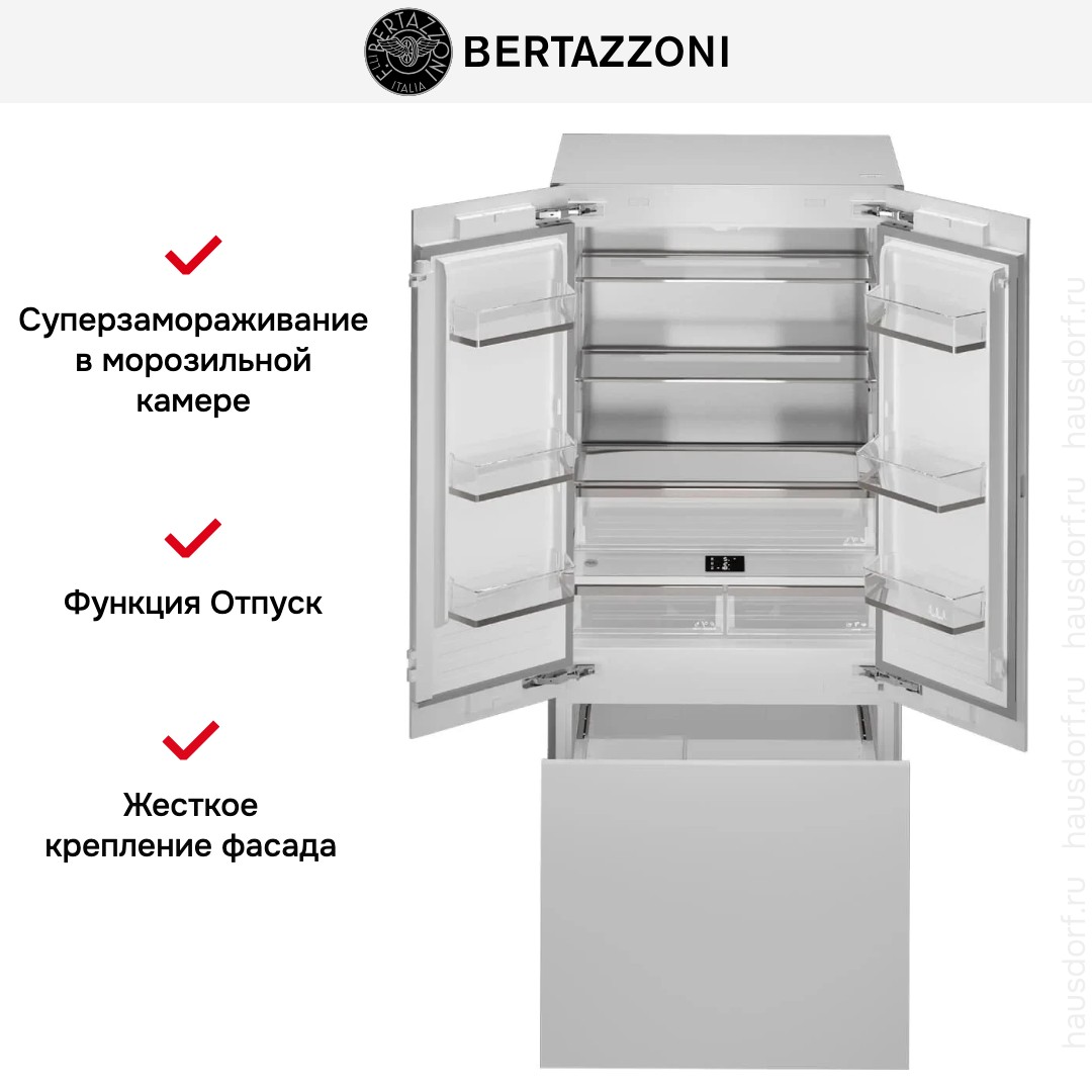 Встраиваемый холодильник Bertazzoni RFD90S5FPNS/24 — флагманская модель, созданная для требовательных ценителей кулинарии и безупречного дизайна. Этот вместительный двухкамерный агрегат с нижним расположением морозильного отделения сочетает профессиональную функциональность, инновационные технологии и элегантную интеграцию в интерьер. Благодаря ширине 90 см и высоте 212,3 см, устройство предлагает максимальное внутреннее пространство, не занимая при этом избыточной площади за счёт умеренной глубины в 55,5 см.