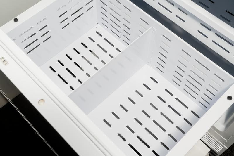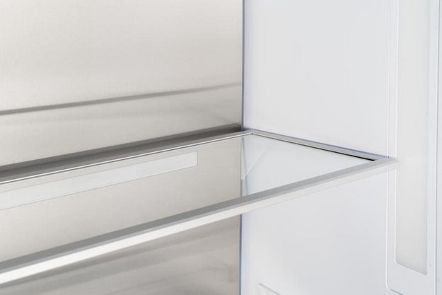 Полки в отделении бывают нескольких типов. Чаще всего встречаются полки из закаленного или ударопрочного стекла. Закаленное стекло выдерживает особенно большие нагрузки до 25 кг, так что на них можно устанавливать посуду из любого материала. Стекло является безопасным нейтральным материалом, не желтеет и не портится со временем, а также быстро и легко моется. Для того чтобы предотвратить проливание жидкости, полки оснащаются металлической или пластиковой окантовкой.