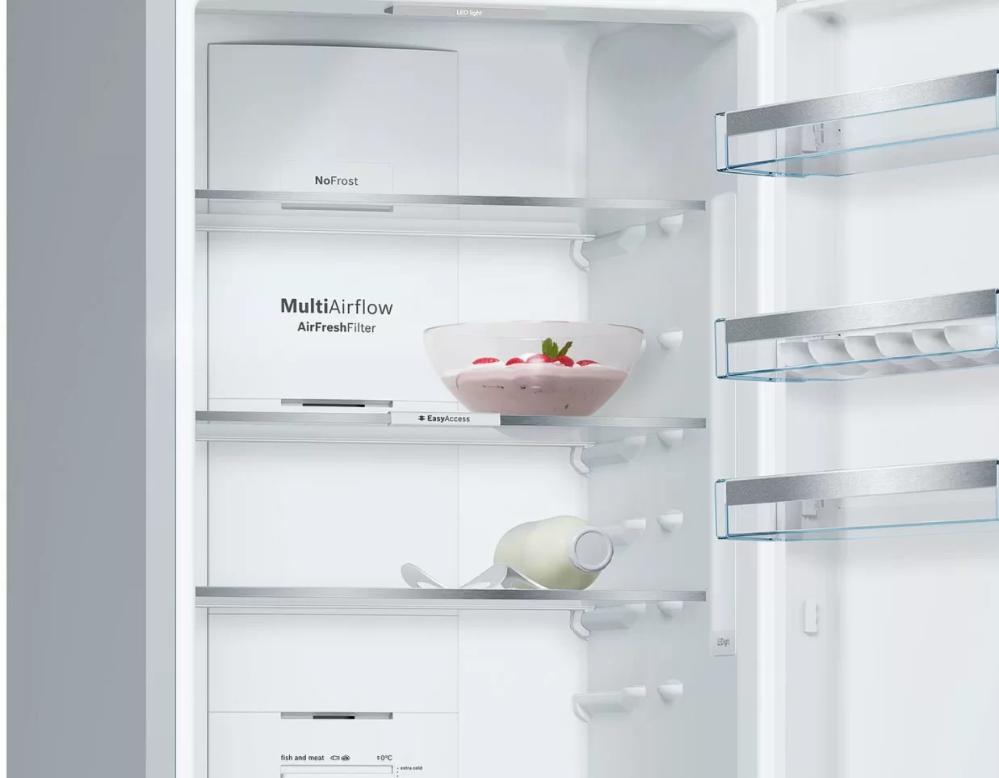 Охлаждение Multi AirFlow в холодильниках Bosch — многопоточная система, которая с помощью вентилятора распределяет холодный воздух по всему пространству холодильной камеры. Воздушные потоки достигают самых труднодоступных уголков, так что температура и влажность во всей камере выравнивается.